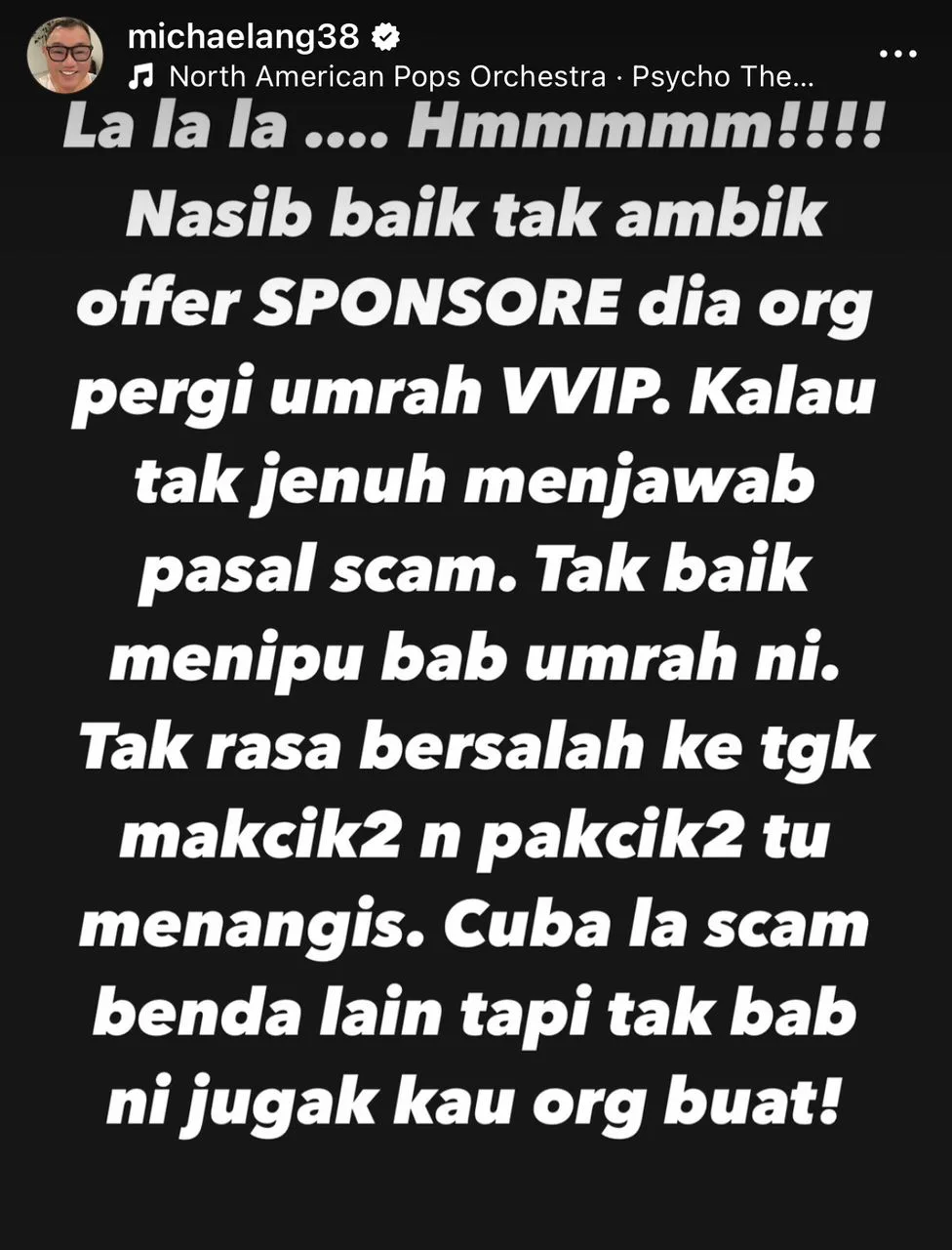 Dengan nada yang agak sinis, Michael turut mengungkapkan rasa simpati terhadap bakal jemaah yang telah ditipu. “Tak baik menipu bab umrah, tak rasa serba salah ke tengok mak cik dan pak cik menangis?” katanya, merujuk kepada kerugian hampir RM2.1 juta yang dialami oleh 314 jemaah yang terlibat.