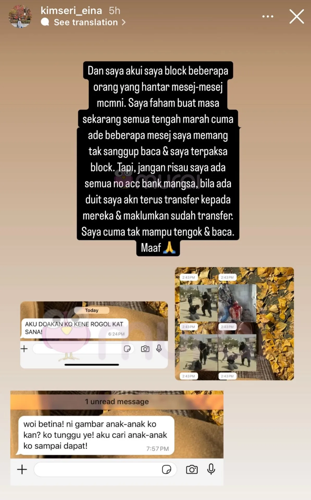 Tapi jangan risau saya ada semua nombor akaun bank mangsa, bila ada duit saya akan terus transfer kepada mereka dan maklumkan sudah transfer. Saya cuma tak mampu tengok dan baca. Maaf.”-tulis Kim Seri lagi