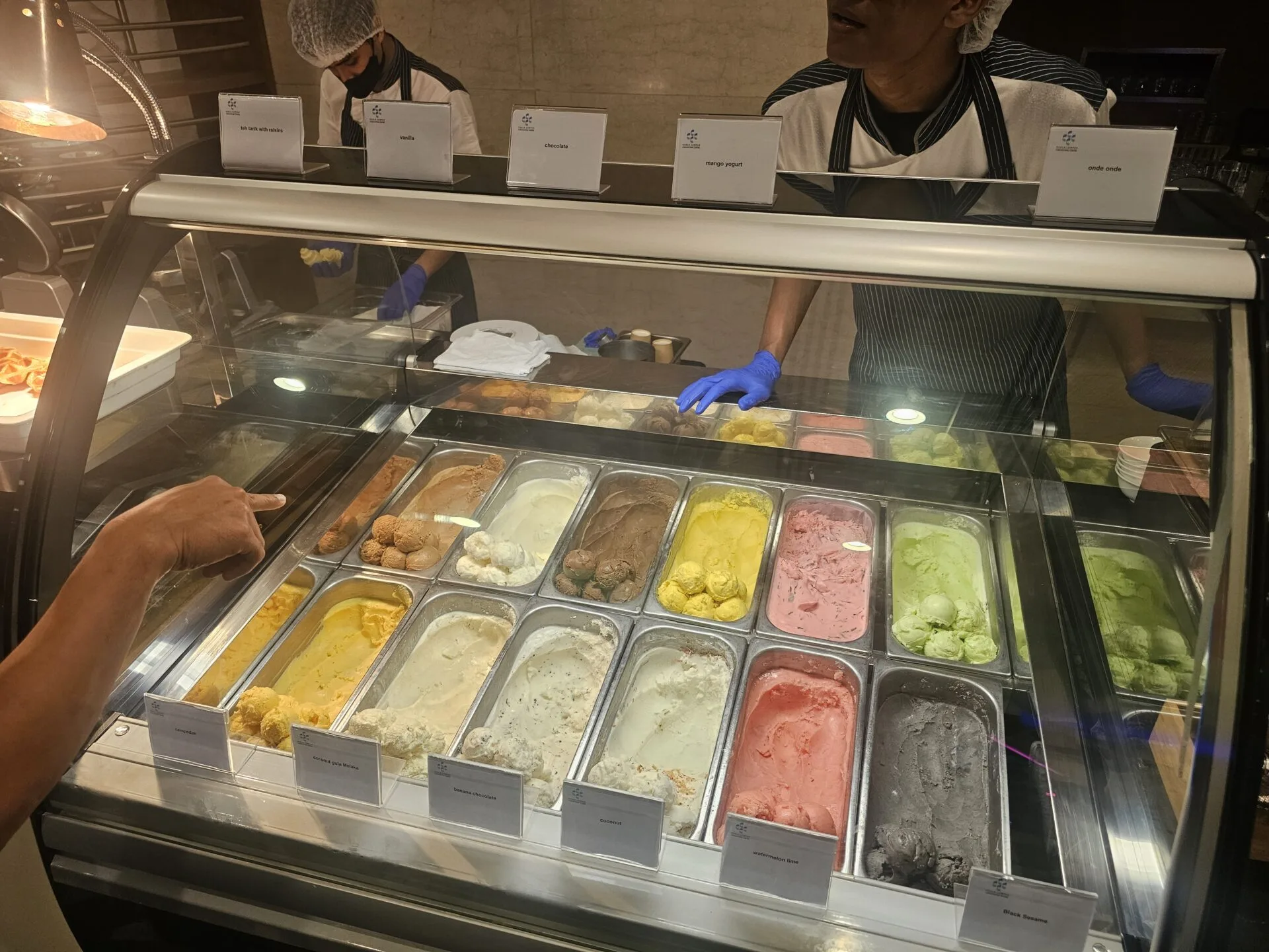 Untuk pencuci mulut, jangan lepaskan peluang merasai aiskrim buatan chef dengan perisa istimewa seperti Teh Tarik, Bandung Cincau, dan Gula Melaka. Dan jika anda peminat kuih tradisional, pastikan anda mencuba aiskrim Onde-Onde, gabungan sempurna lemak santan dan kelazatan gula Melaka.