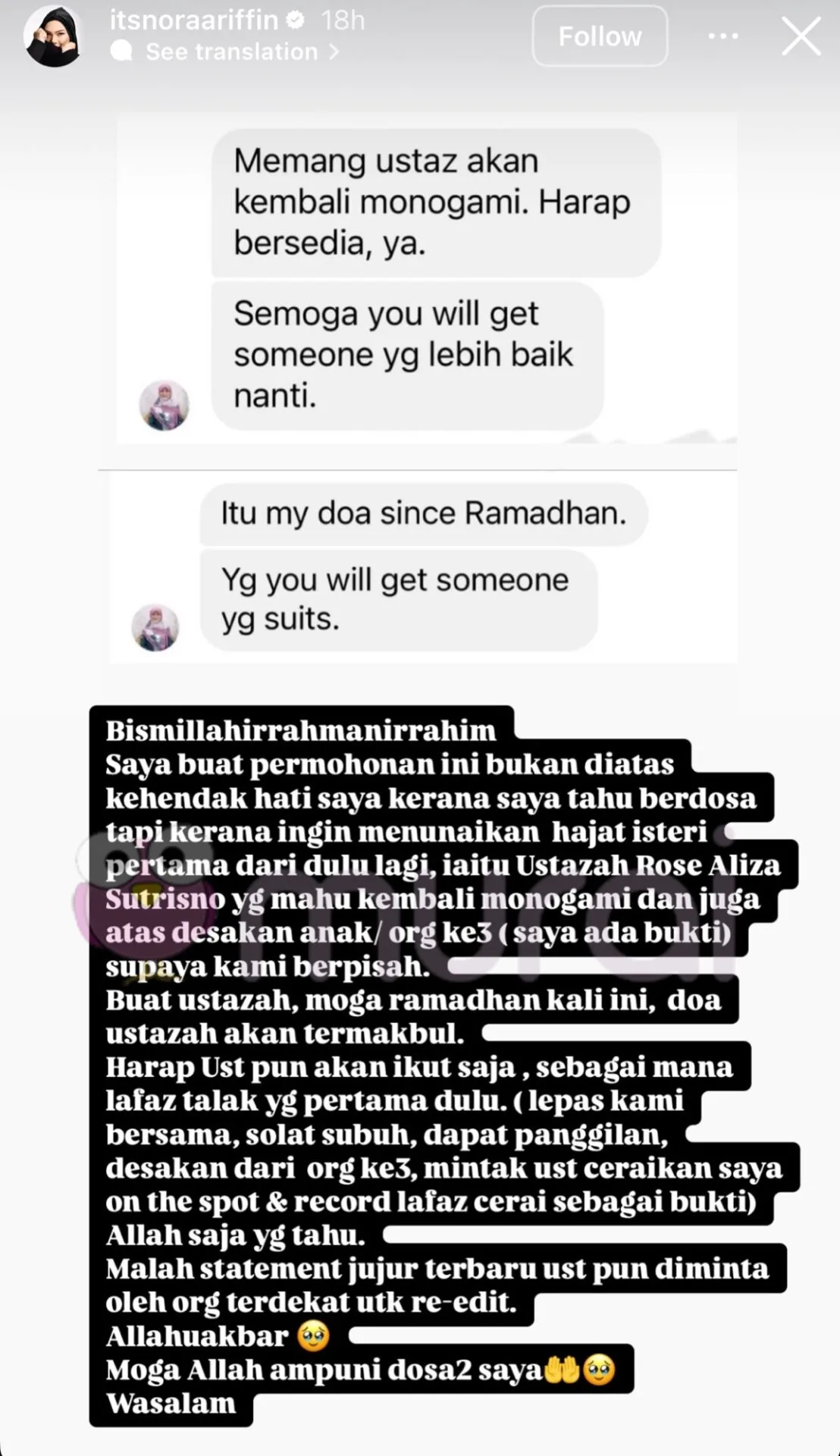 “Saya buat permohonan ini bukan di atas kehendak hati kerana saya tahu berdosa tapi kerana ingin menunaikan hajat isteri pertama dari dulu lagi iaitu Ustazah Rose Aliza Sutrisno yang mahu kembali monogami dan juga atas desakan anak/ orang ke-3 (saya ada bukti) supaya kami berpisah.”-tulis Nora di Insta Stories