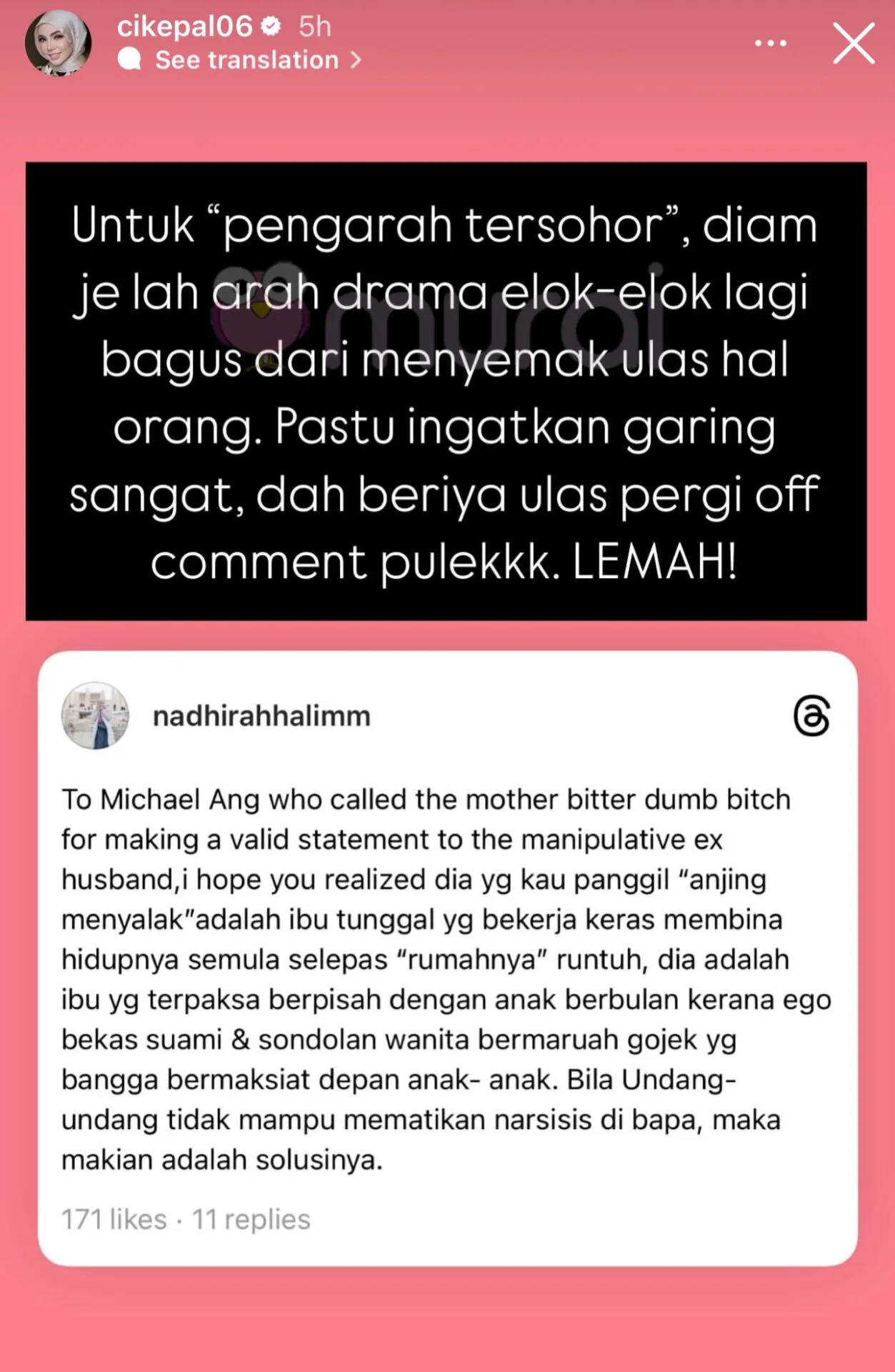 Tidak berdiam diri, Cik Epal menerusi Insta Stories, membidas kenyataan Michael dengan memintanya untuk berdiam diri dan memberikan fokus kepada mengarah drama berbanding mengulas hal orang lain.