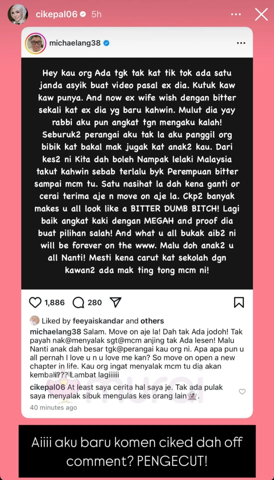 Michael Ang, menerusi hantaran di Instagram, menyifatkan pempengaruh media sosial tersebut sebagai ‘bitter’ kerana menitipkan ucapan ‘pedas’ buat perkahwinan kedua jofliam.