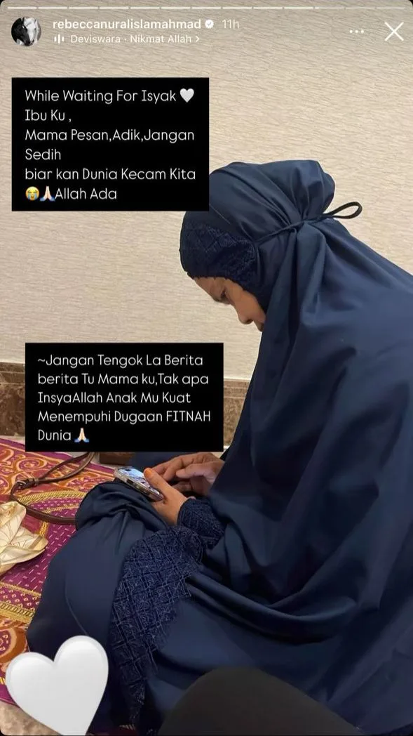 Dalam satu perkongsian di media sosial, Rebecca mendedahkan pesanan lembut ibunya yang menyentuh hati. Ketika sedang bersiap untuk solat, ibunya menasihatinya agar tidak bersedih dengan kecaman dunia. “Biarkan dunia kecam kita, Allah ada. Jangan tengok berita-berita itu,” kata ibunya, cuba menenangkan jiwa anak yang kini berdepan dengan pelbagai tohmahan.