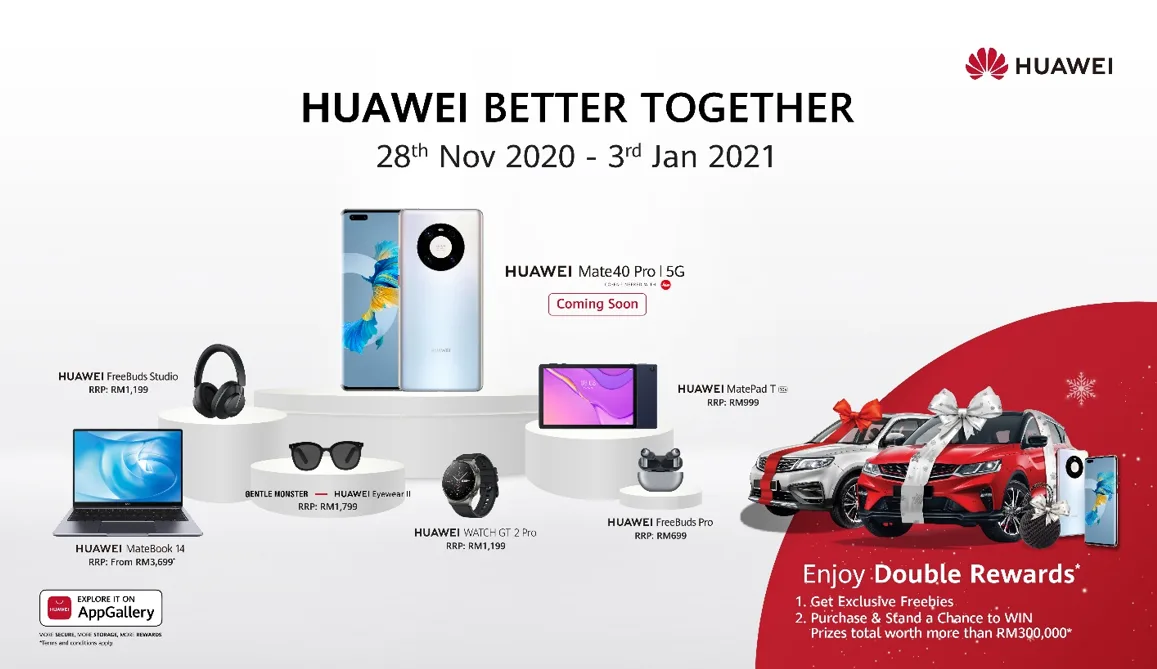 HUAWEI telah melancarkan pelbagai produk luar biasa seperti HUAWEI FreeBuds Pro pada harga RM699 dan WATCH GT 2 PRO berharga RM1,199 untuk memenuhi keperluan kehidupan seharian anda. Dari 28 November 2020 hingga 3 Januari 2021, pengguna akan menikmati ganjaran berganda apabila membeli HUAWEI MatePad T 10s, FreeBuds Pro atau WATCH GT 2 Pro.