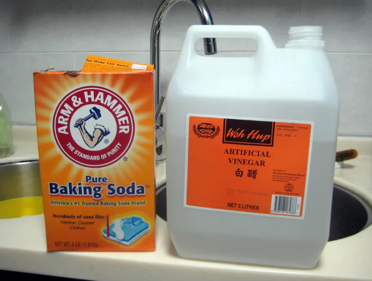 Campurkan soda bikarbonat dengan sedikit cuka dan biarkan ia menjadi pes. Sapukan pes ini pada permukaan oven yang terdapat kesan kotoran dan biarkan selama 1 hingga 12 jam. Makin lama makin berkesan tetapi bergantung juga pada kesan kotoran yang terdapat pada permukaan oven, kemudian lap dan bilas.