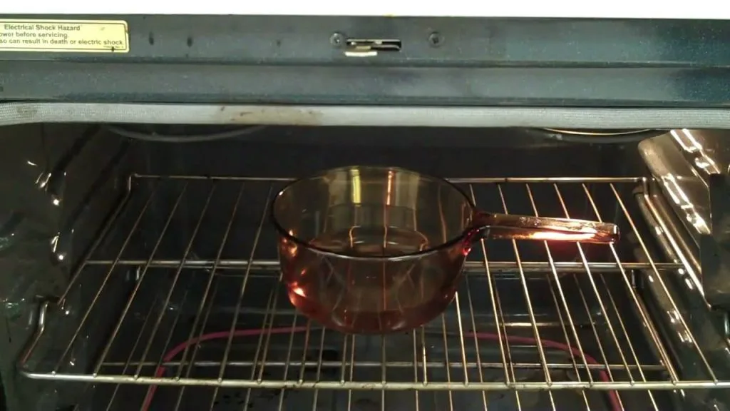 Isikan air di dalam mangkuk atau bekas yang tahan panas dan letakkan di dalam oven. Pasangkan oven pada suhu yang tinggi lebih kurang 20 minit. Cara ini mampu menanggalkan gris, minyak dan kerak pada setiap permukaan oven.