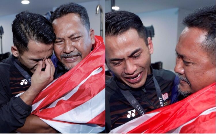 Namun apa yang mencuri perhatian adalah di saat Amsyar memeluk bapanya dan kedua-duanya tidak menahan sebak sebaik sahaja Amsyar berjaya merangkul pingat emas bagi acara 1 meter papan anjal lelaki di Sukan Sea KL2017.