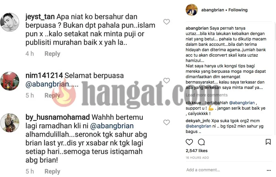 Namun begitu, dek kerana ingin berpuasa Brian telah dikecam oleh netizen keran menganggapnya sebagai sekadar mencari publisiti murahan. Bersabarlah Brian!