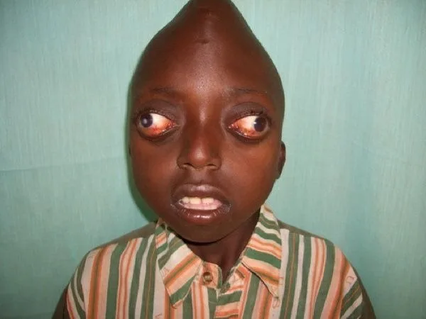 Sindrom ini akan menyebabkan kecacatan tengkorak yang akan membuatkan bola mata terkeluar dari soketnya dan telinga akan menurun ke bawah yang membawa kepada masalah penglihatan dan pendengaran.