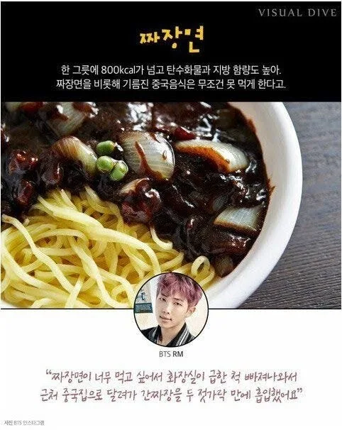 Jajangmyeon atau mee bersama sos kacang hitam ini tersenarai dalam salah satu makanan yang begitu digemari ramai di Korea. Tetapi malangnya, ia juga turut menjadi makanan yang dilarang untuk dimakan oleh artis pelatih K-pop semasa menjalani tempoh latihan. Lebih-lebih lagi, semangkuk jajangmyeon menyumbang sekitar 800 kcal lemak. RM dari kumpulan BTS sekali lagi mempunyai kenangan ketika makan jajangmyeon sewaktu menjalani tempoh latihan.