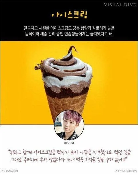 Pelbagai makanan manis yang boleh menjadi malapetaka buat setiap artis pelatih K-pop. Hal ini kerana boleh membuatkan berat badan mereka akan bertambah. Hal ini juga turut terjadi kepada RM dan V dari kumpulan BTS yang menghadapi masalah kerana makan aiskrim secara senyap-senyap semasa menjalani tempoh latihan.