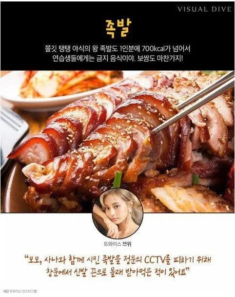Di Korea, kaki khinzir menjadi salah satu hidangan lazat yang tidak dapat dipisahkan. Bayangkan hanya sekali makan sahaja sudah menyumbang sebanyak 700 kcal dalam satu hidangan. Hal ini menyebabkan artis pelatih K-pop dilarang untuk memakannya. Namun Tzuyu dari kumpulan TWICE pernah memakan kaki khinzir secara senyap semasa menjalani tempoh latihan.
