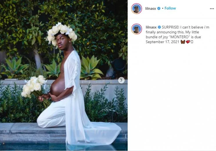 Siapa yang tidak kenal dengan rapper nombor 1 Amerika iaitu Lil Nas X. Dia yang membuat kejutan dengan pengumuman ‘kehamilan’ melalui gambar dengan perut besar. Namun jangan terkejut, itu hanyalah cara unik rapper yang berusia 22 tahun ini untuk mengumumkan muzik terbarunya ‘Montero’. Lil Nas X memberitahu bahawa dia akan melancarkan projek terbarunya pada 17 September 2021. Di dalam potret tersebut, Nas X mengenakan jubah satin berwarna putih dengan bunga mahkota dan perut yang seakan mengandung. Dia memberitahu bahawa idea untuk foto ‘kehamilan’ ini tercetur setelah mendengar lirik lagu Dolla Sign Slime milik Megan Thee Stallion.