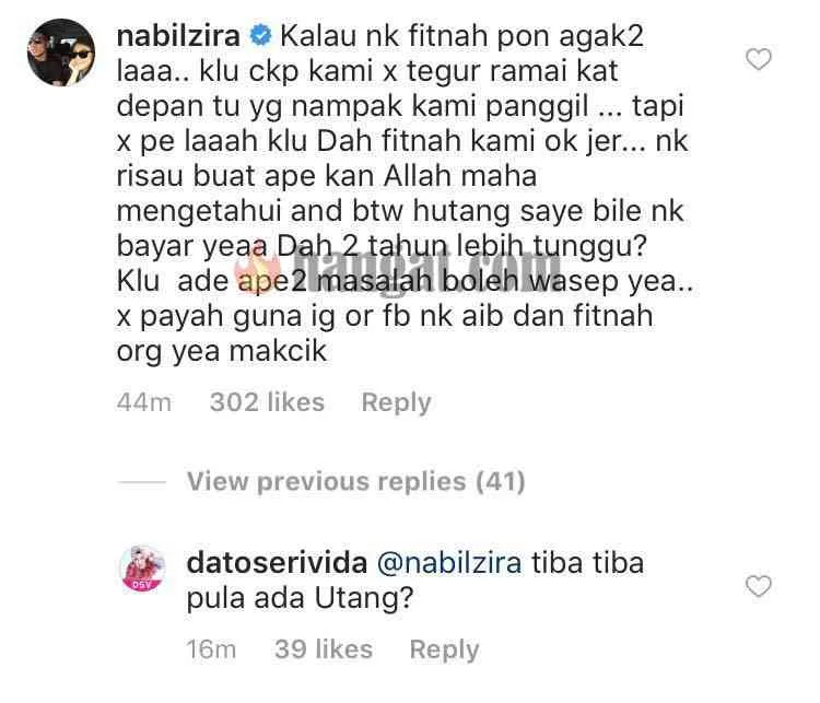Membalas kenyataan yang dikeluarkan Vida, Nabil menerusi ruangan komen Instagram usahawan itu menuntut hutangnya yang tertunggak. Malah menerusi kenyataan sebuah portal hiburan, Nabil memberitahu Vida masih berhutang dengannya sejumlah RM30,000 sejak dua tahun yang lalu.