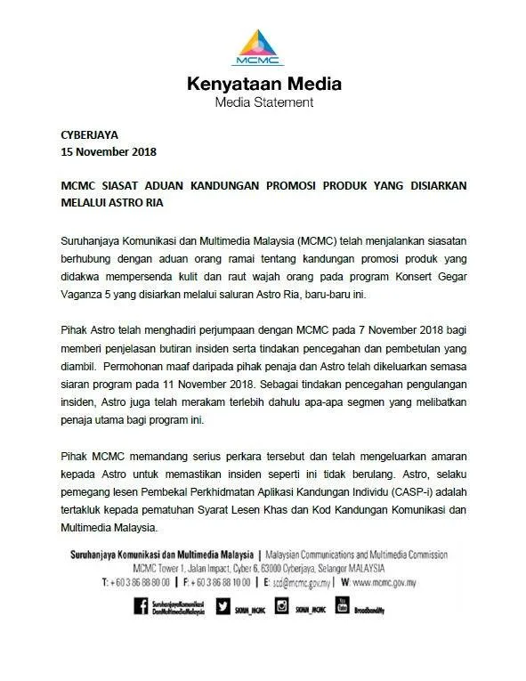 Dalam kenyataan itu, MCMC memandang serius akan isu tersebut dan amaran tersebut diberi agar perkara yang sama tidak lagi terjadi pada masa akan datang.