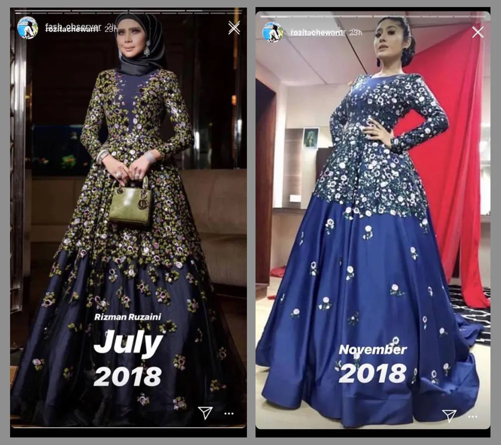 Disebalik kecantikan baju tersebut, timbul pula dakwaan yang mengatakan rekaan tersebut seperti sama dan seolah-olah meniru busana pelakon Rozita Che Wan atau lebih mesra disapa sebagai Che Ta yang direka oleh Rizman Ruzaini. Dakwaan tersebut seterusnya turut mencetuskan pertelagahan peminat kedua-dua selebriti tersebut di laman Instagram.