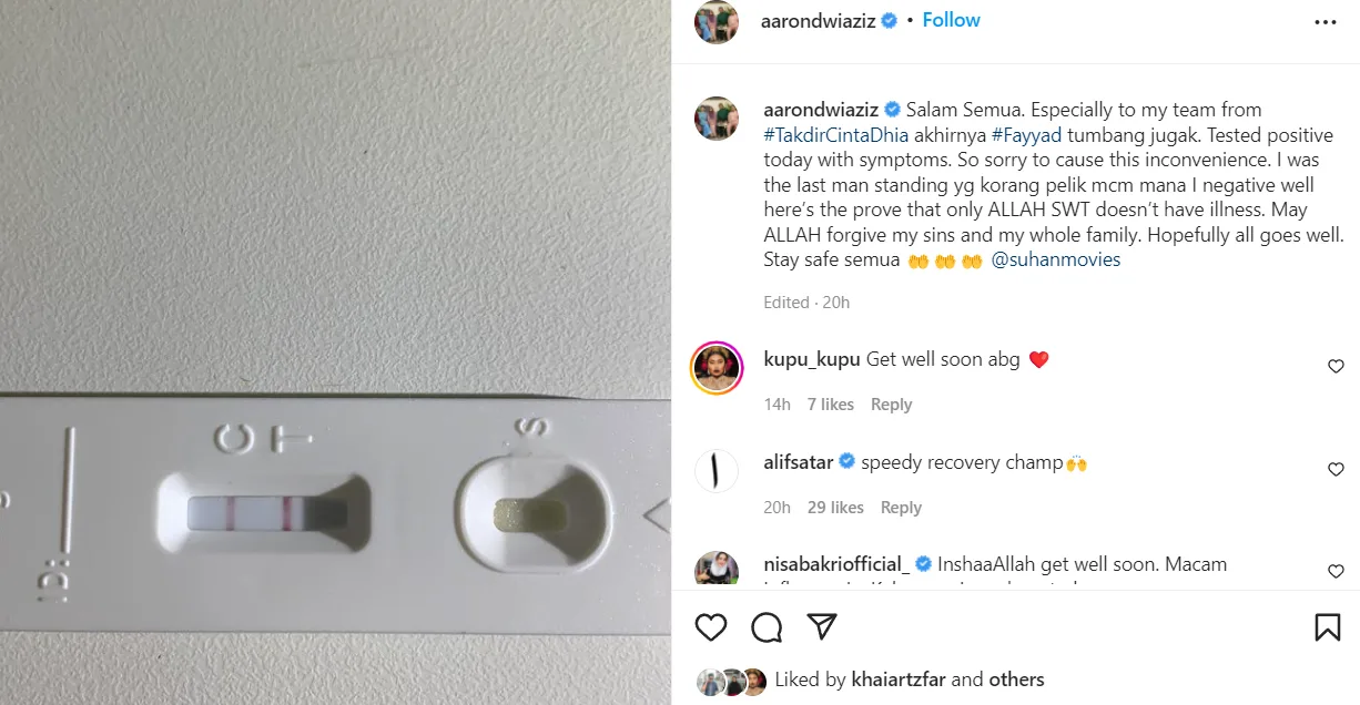 “Salam semua, Terutamanya pada pasukan saya dari #TakdirCintaDhia akhirnya #Fayyad tumbang jugak. Disahkan positif hari ini dengan gejala. Maaf kerana menyebabkan kesulitan ini.”- tulis Aaron