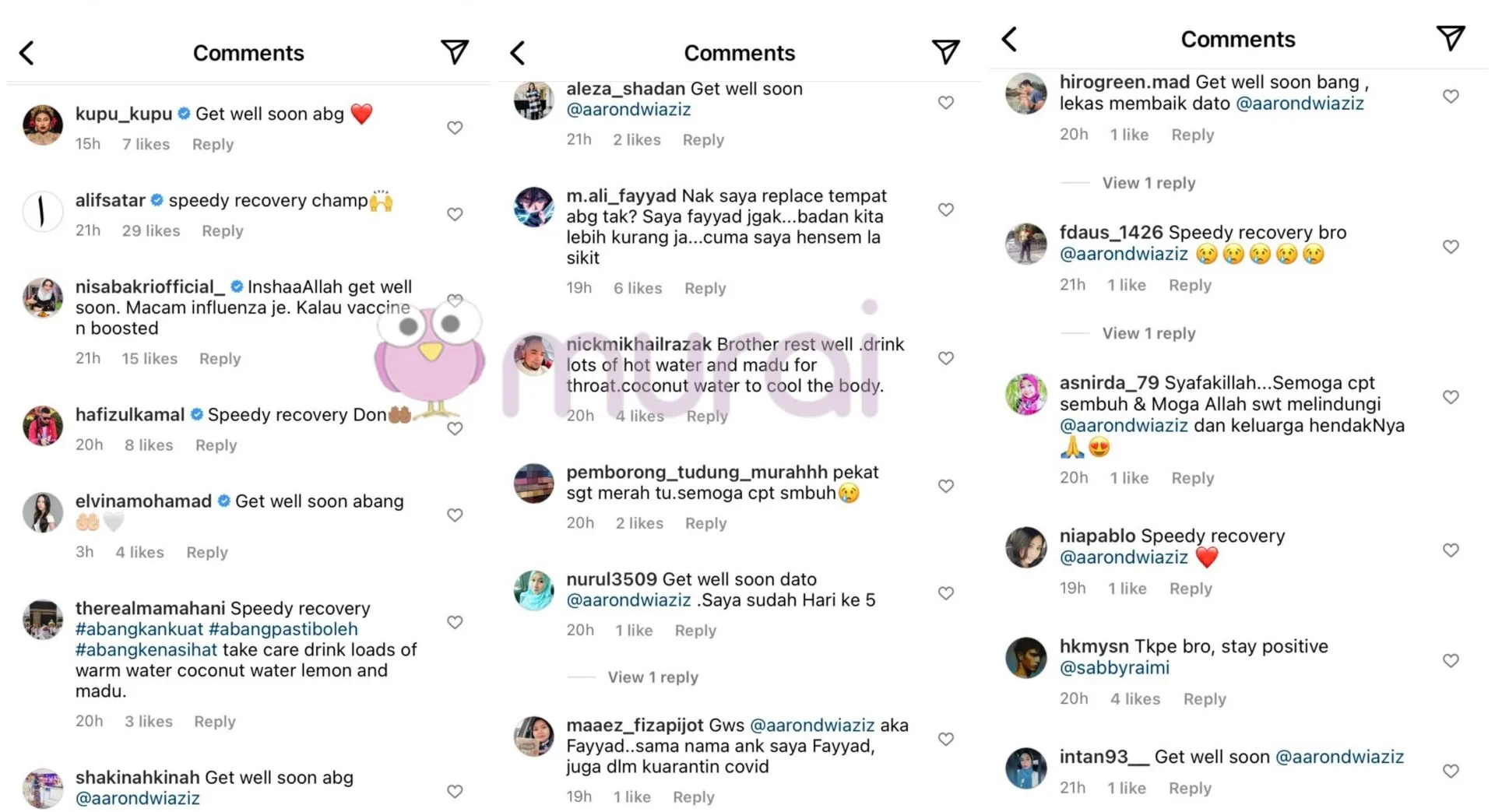 Tinjauan Murai.my di ruangan komen hantaran Aaron mendapati rata-rata peminat dan rakan selebriti tampil menitipkan doa agar pelakon itu diberikan kesembuhan dengan cepat.