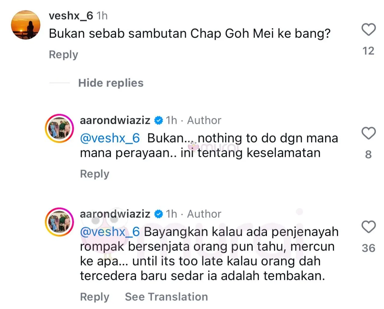 Dalam pada itu, Aaron turut menjelaskan pertunjukan bunga api yang dimaksudkan tidak berkaitan dengan mana-mana perayaan, namun ia adalah mengenai keselamatan.