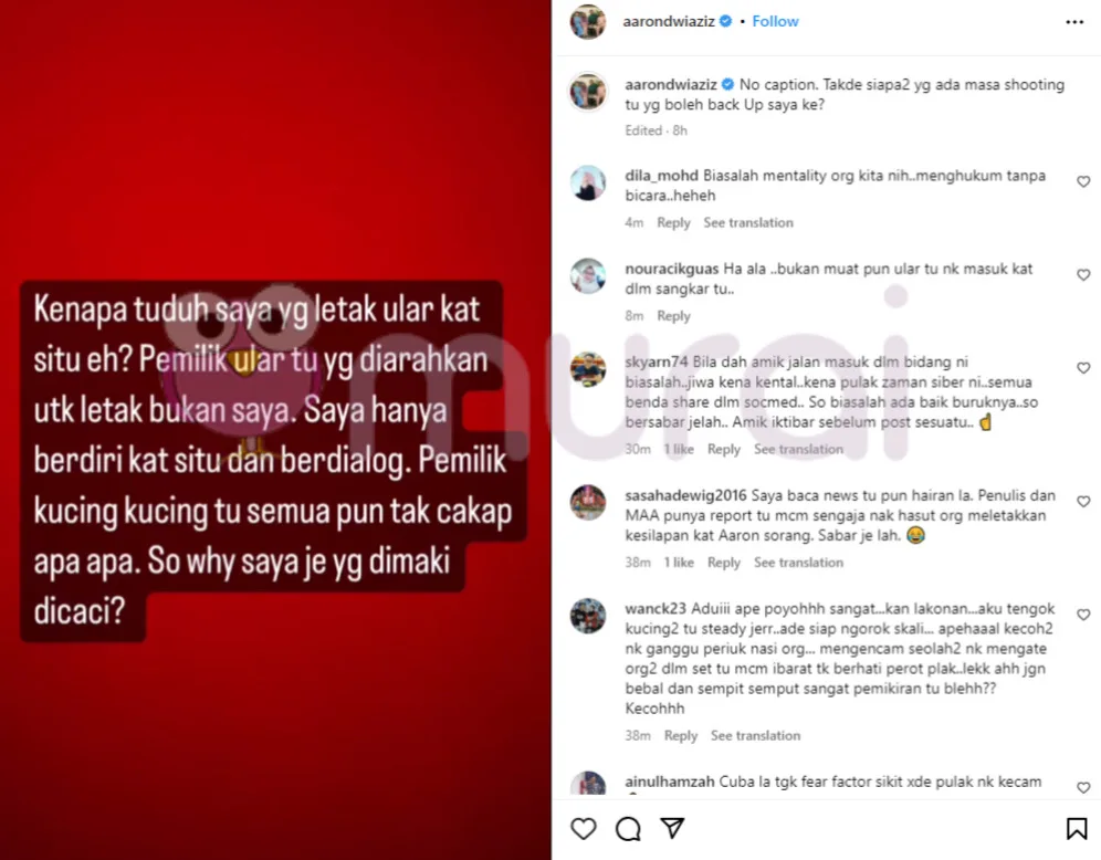 Dalam pada itu, Aaron turut mempersoalkan pihak terlibat yang menuduhnya meletakkan ular berdekatan sangkar kucing, sedangkan dirinya hanya berdiri di situ dan melontarkan dialog ketika penggambaran dijalankan.