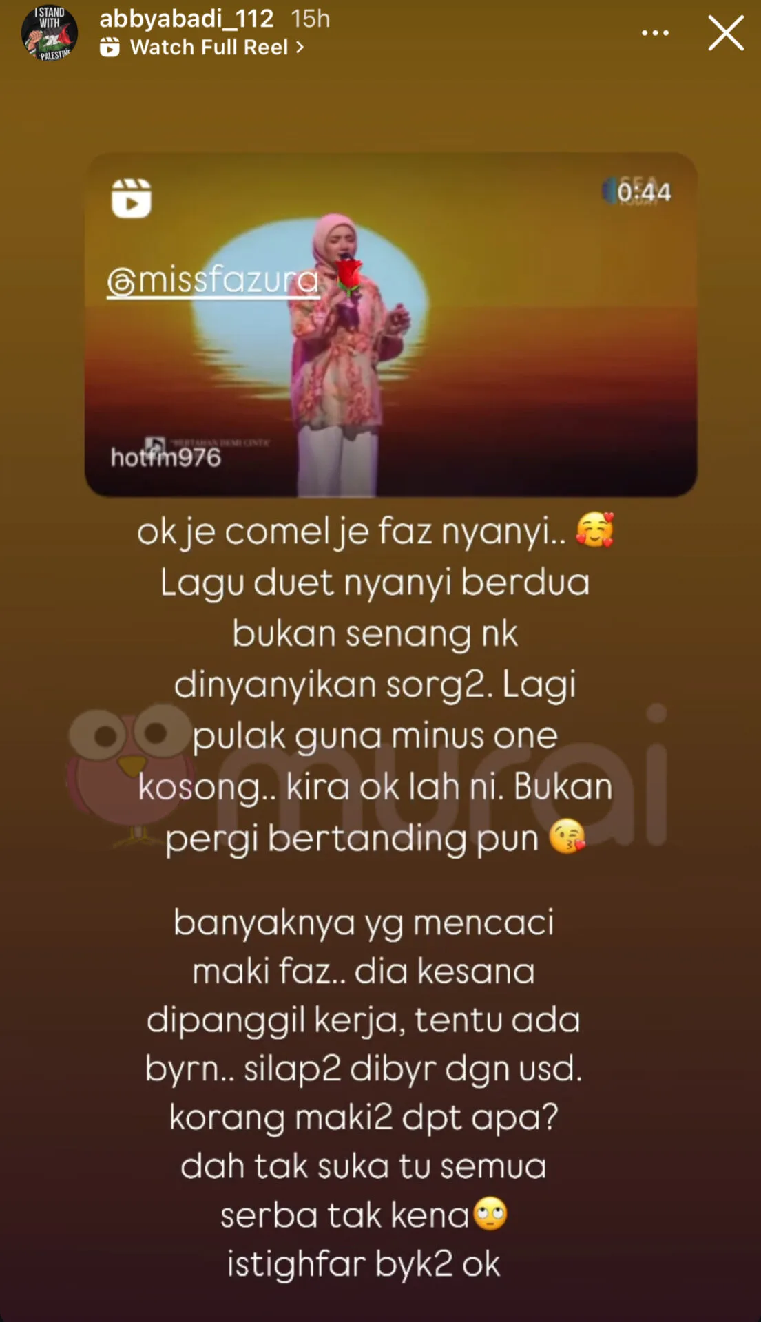 “Okay je, comel je Fazura nyanyi. Lagu duet nyanyi berdua bukan senang nak dinyanyikan sorang-sorang. Lagi pulak, guna minus one kosong. Kira okay la ni. Bukan pergi bertanding pun.”-tulis Abby Abadi di Insta Stories