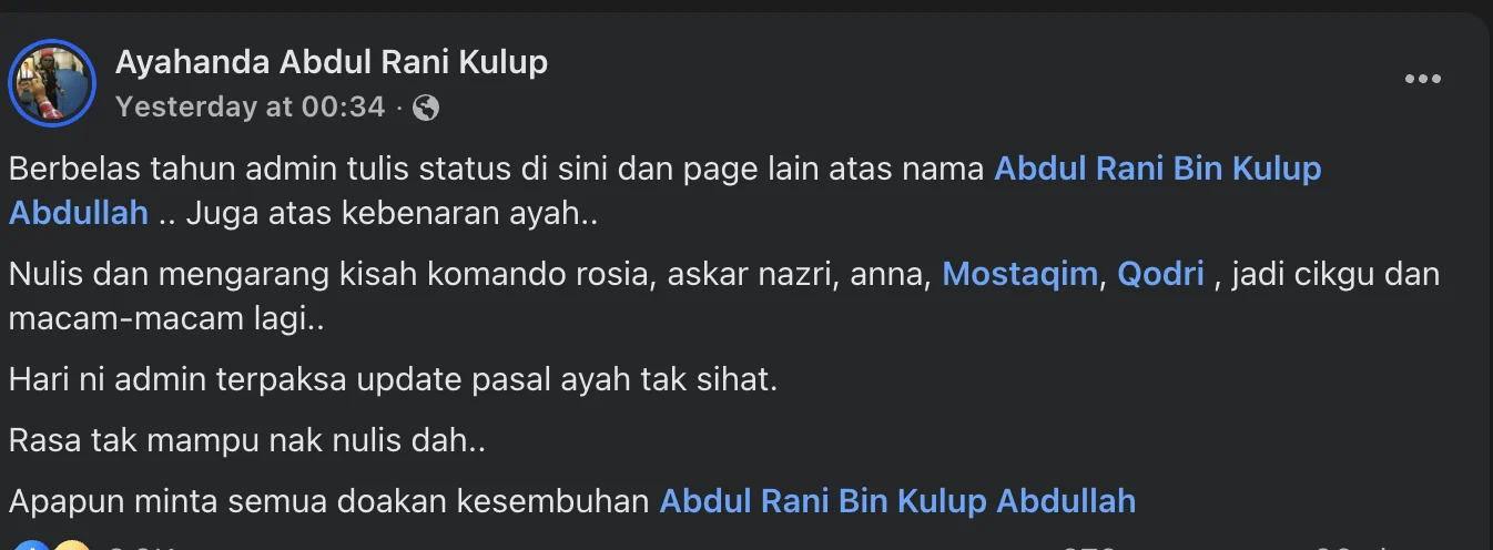 “Berbelas tahun admin tulis status di sini dan page lain atas nama Abdul Rani Bin Kulup Abdullah… juga atas kebenaran ayah.