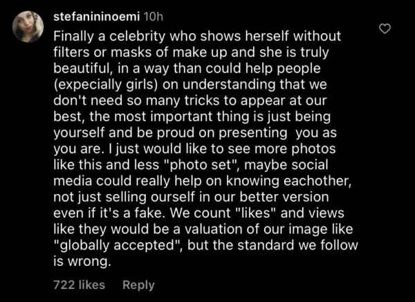 Walaupun sesetengah selebriti tidak pernah menyiarkan foto tanpa penapis, solekan atau suntingan profesional. Selena sebaliknya mengambil langkah berani.