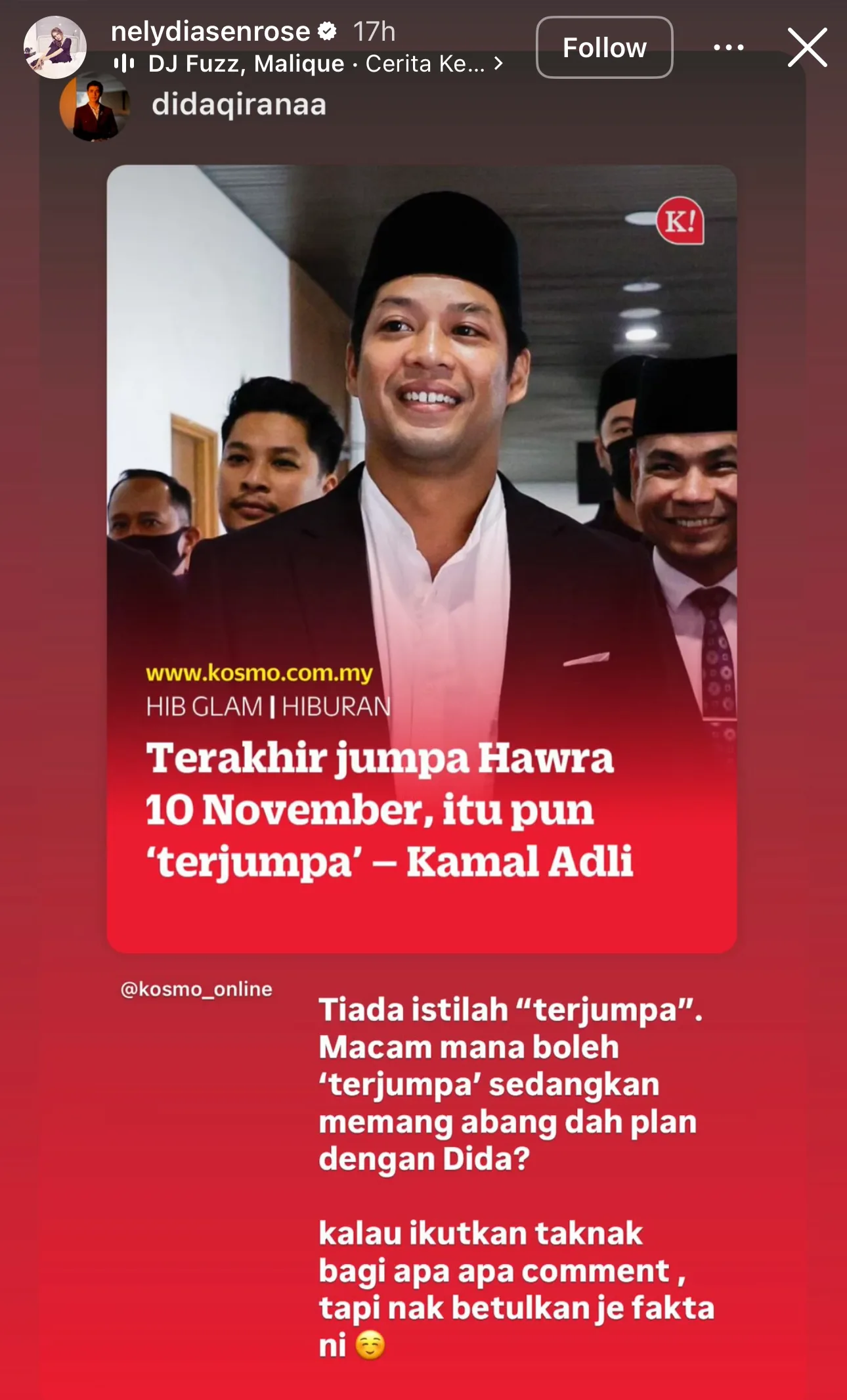 Kenyataan Kamal mendapat reaksi adik kepada isterinya, Uqasha Senrose iaitu Farza Dida menerusi hantaran di Insta Stories yang memuatnaik semula keratan artikel mengenai kenyataan abang iparnya itu dengan mempersoalkan kenyataan Kamal yang mendakwa dia sukar untuk bertemu dengan Hawra, sedangkang Kamal memang sudah merancang dengannya.