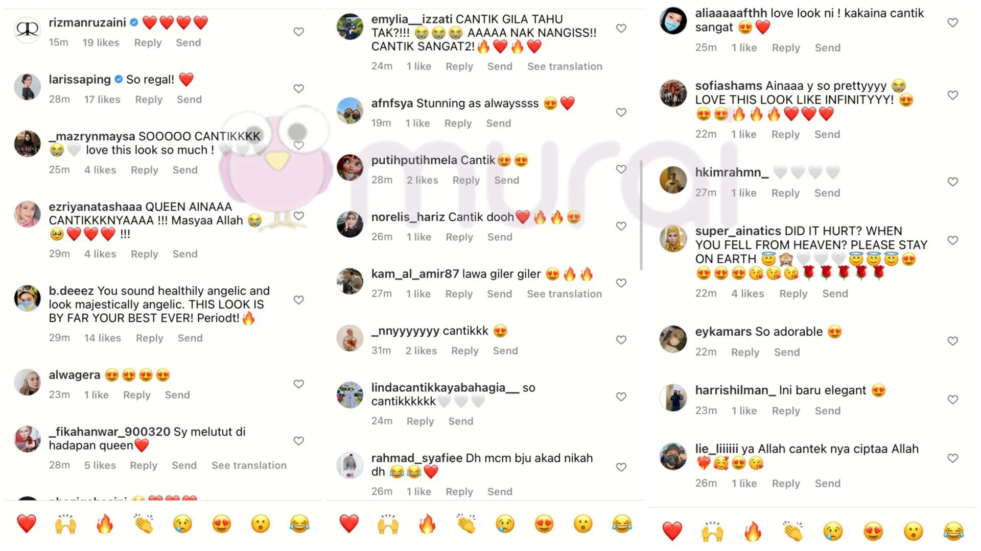 Tinjauan Murai MY di ruangan komen mendapati rata-rata peminat membanjiri hantaran Aina di Instagram dengan kata-kata pujian terhadap penampilan penyanyi lagu Sumpah itu.