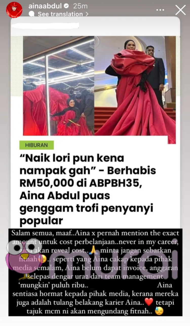“Aina tak pernah mention the exact amount untuk kos perbelanjaan. Never in my career, Aina akan reveal cost. Minta jangan sebarkan fitnah.