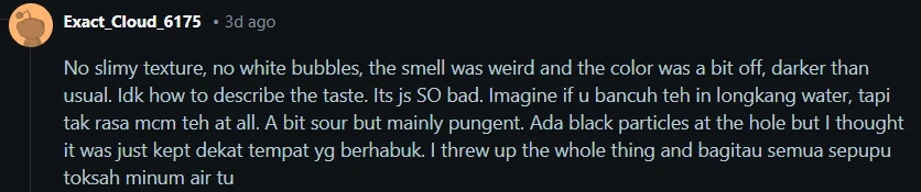 Menurut salah seorang pengguna, minuman yang diminum mempunyai bau yang pelik, warna lebih gelap daripada biasa serta rasa yang sukar digambarkan.