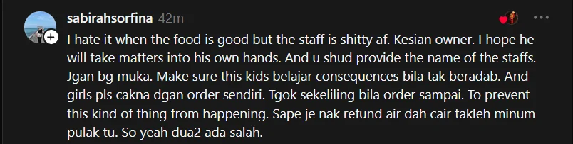 Menariknya, pelanggan itu sendiri menasihatkan orang ramai agar tidak memboikot premis tersebut, sebaliknya berharap isu sikap pekerja dapat ditangani dengan lebih serius oleh pihak pengurusan.
