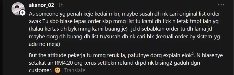 Ada juga yang menekankan pentingnya pelanggan menyemak pesanan sebaik sahaja makanan atau minuman dihantar bagi mengelakkan salah faham.