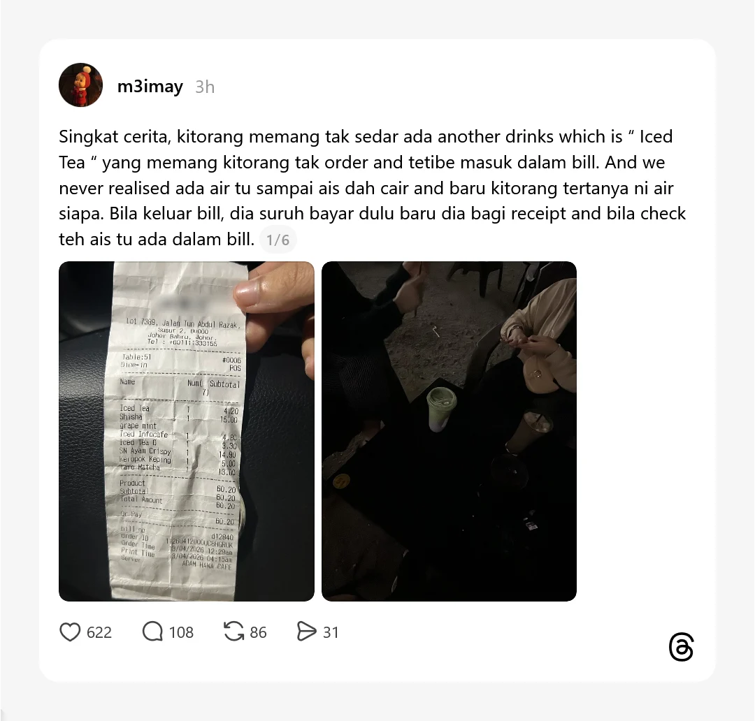 Namun, situasi menjadi janggal apabila minuman tersebut turut tersenarai dalam bil pembayaran. Pelanggan berkenaan kemudian cuba mendapatkan penjelasan dengan meminta salinan senarai pesanan asal sebagai bukti bahawa minuman itu tidak pernah dipesan.