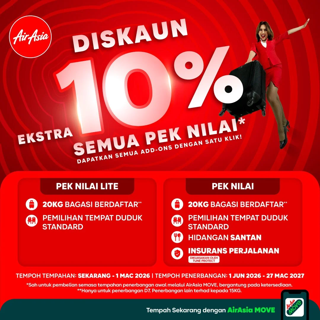 Sebagai bonus, ada juga potongan tambahan 10 peratus untuk tempahan Value Pack yang merangkumi hidangan, insurans perjalanan dan pemilihan tempat duduk. Namun tawaran ini sah semasa tempahan awal melalui aplikasi AirAsia MOVE dan tertakluk kepada ketersediaan.