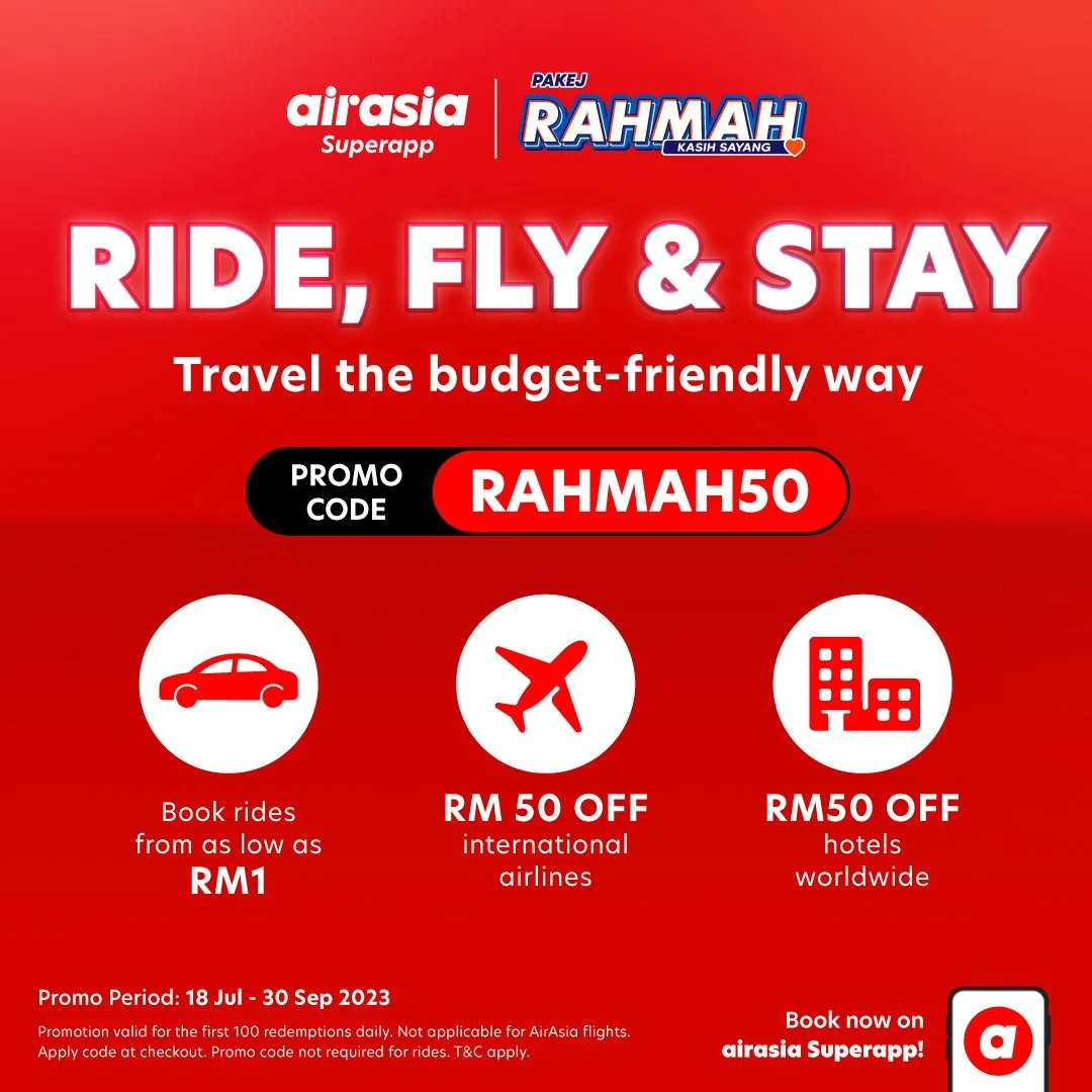 Setiap tempahan RM1 airasia ride akan diberi peluang untuk menebus Pakej Rahmah ‘Ride, Fly & Stay’ di mana pengguna airasia ride itu akan menerima kod promosi RAHMAH50 untuk potongan harga RM50 untuk tempahan hotel dan potongan harga RM50 untuk tempahan penerbangan ke mana-mana destinasi antarabangsa melalui platform OTA (ejen pelancongan dalam talian).