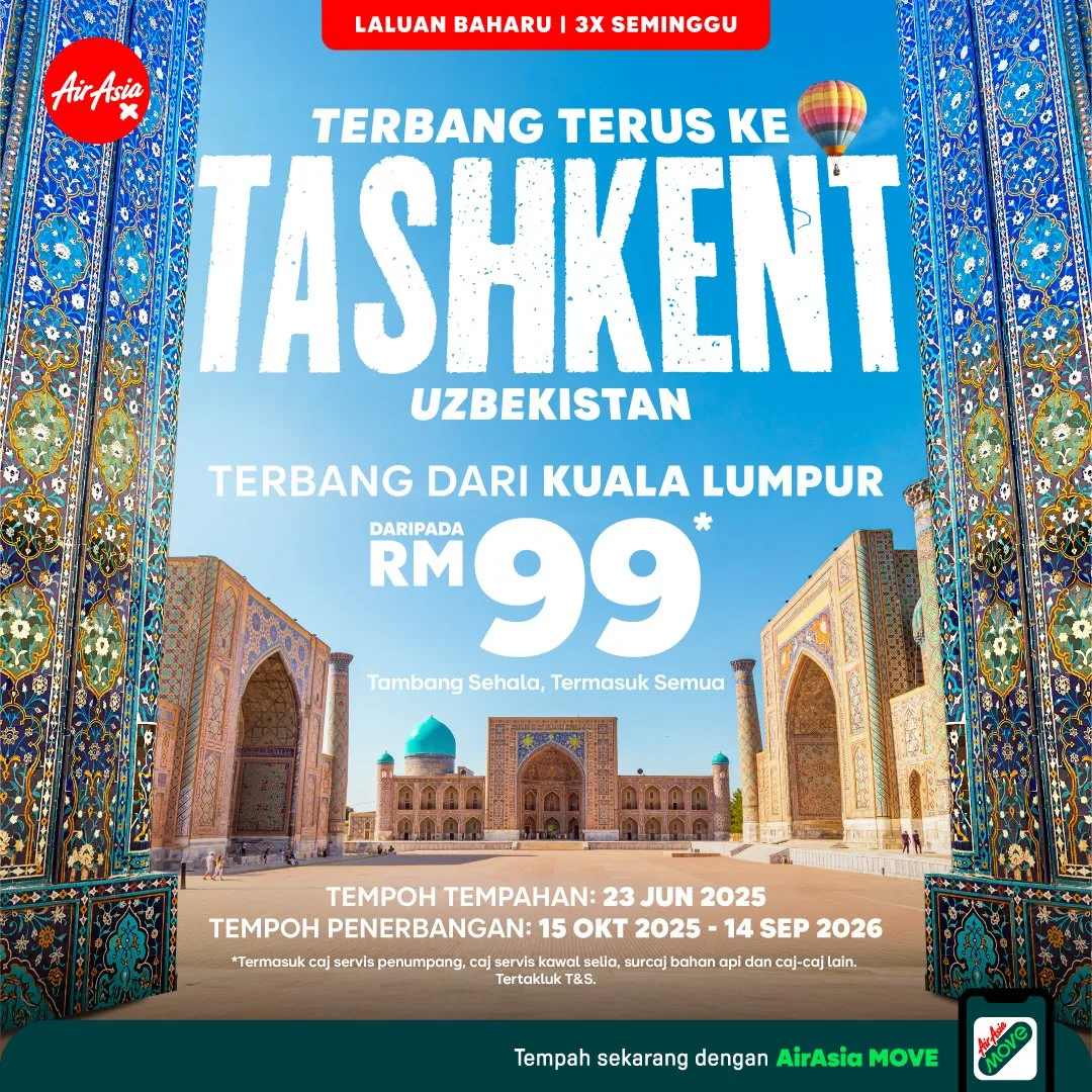 Dan berita baiknya? AirAsia X baru je umumkan laluan terus ke Tashkent, ibu kota Uzbekistan, bermula 15 Oktober 2025, dengan penerbangan sebanyak tiga kali seminggu dari Kuala Lumpur. Kiranya, negara yang dulunya kita hanya lihat dalam dokumentari kini boleh dijelajah sendiri dan yang paling best, harga promosi bermula RM99 sehala sahaja!