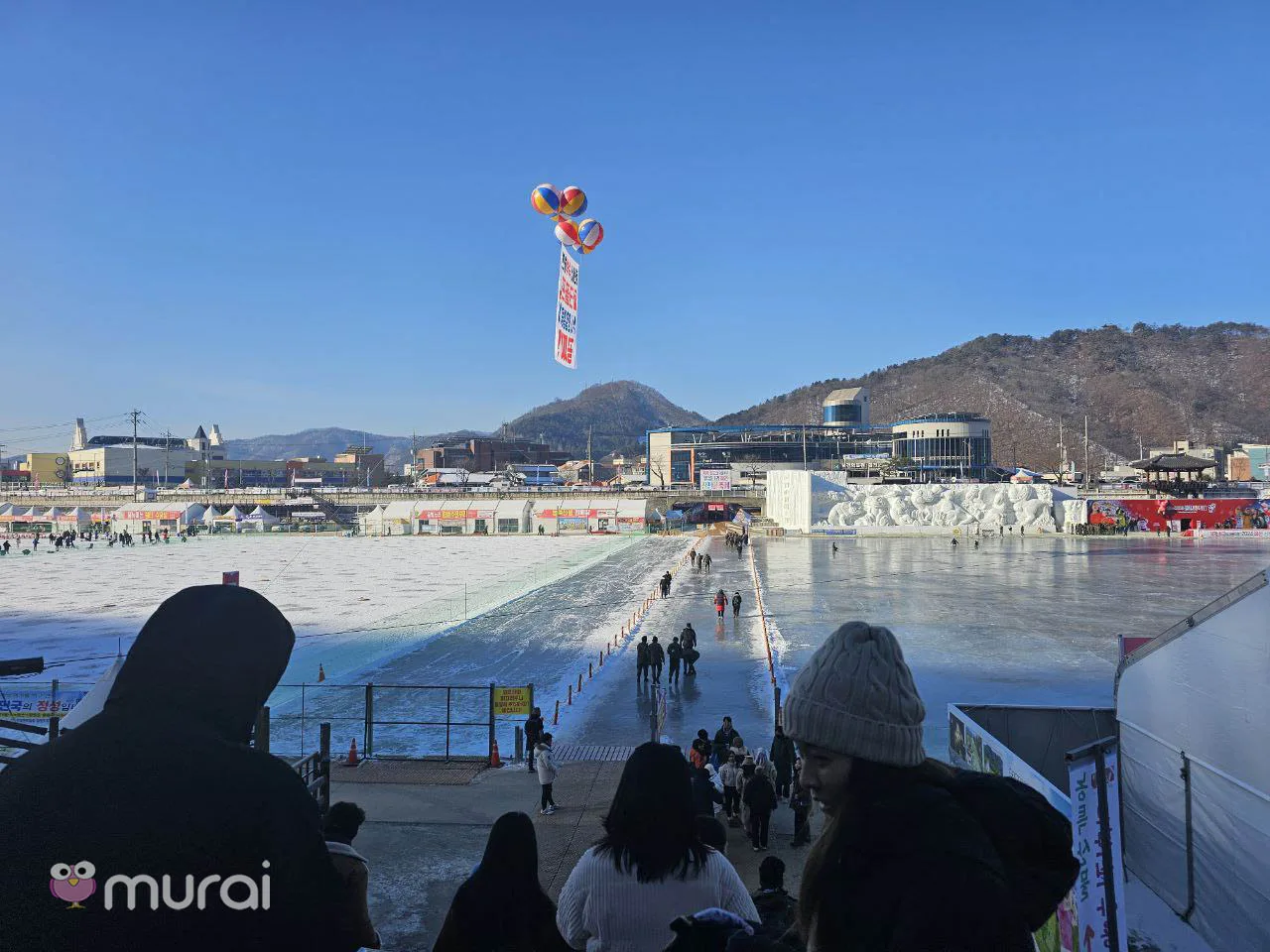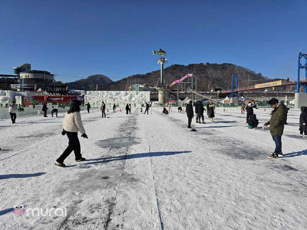 Semasa melawat festival ais, pastikan andatidak melepskan melihat arca salji gergasi yang dikatakan terbesar di dunia. Terdapat banyak arca ais besar dengan lampu berwarna-warni di dalamnya. Saya sangat seronok menuruni gelongsor ais gergasi. Ini adalah projek bersama antara Pesta Ais Hwacheon Sancheoneo dan Pesta Tanglung Ais Harbin di Harbin, Wilayah Heilongjiang, jauh di utara China. Kedua-dua perayaan ini adalah sebahagian daripada empat festival musim sejuk terbaik di dunia.