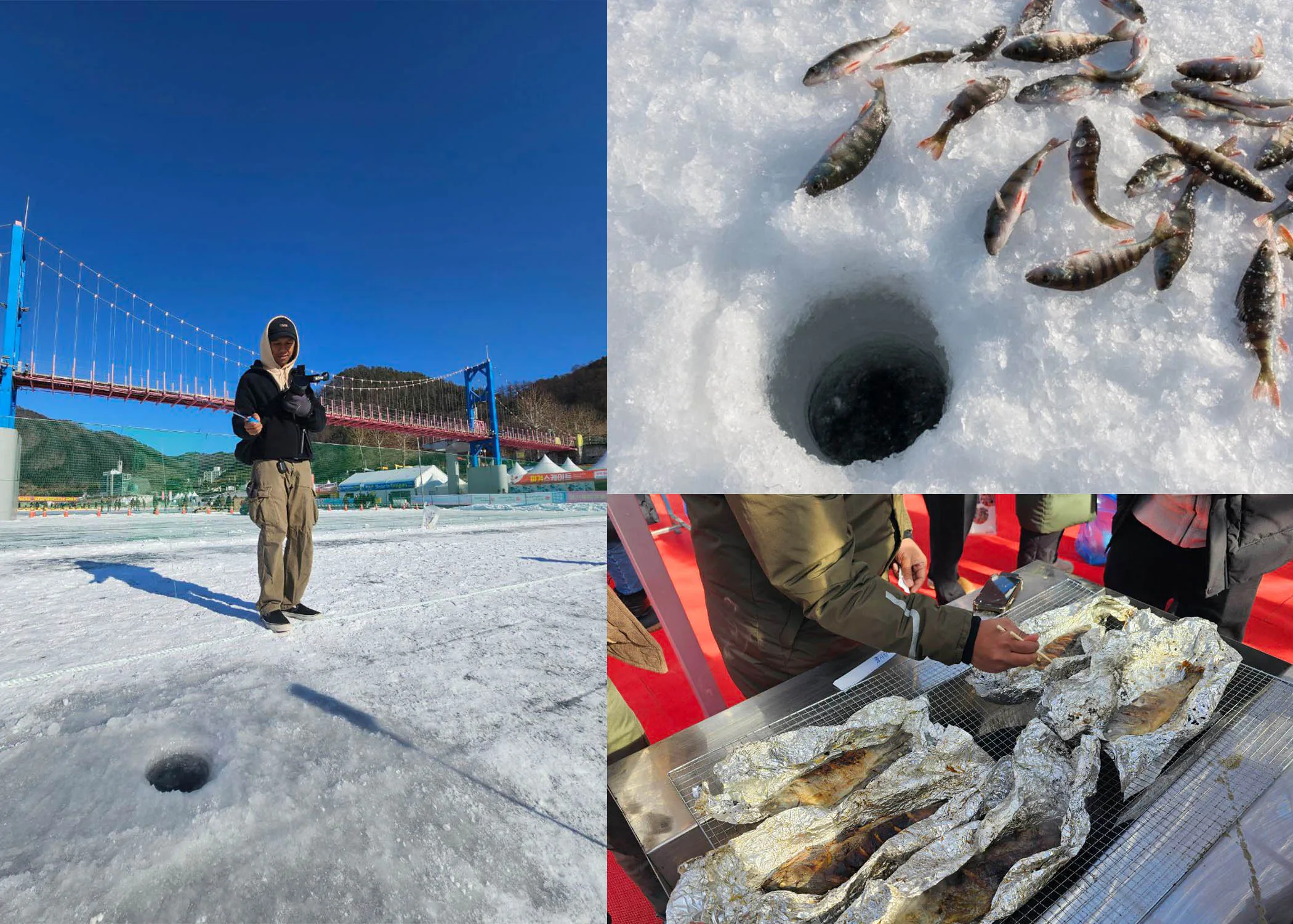 Aktiviti di mulakan dengan membuat lubang di tengah lapisan ais tebal yang menutupi permukaan tasik. Walaupun udaranya sejuk dan kadangkala membuatkan tangan terasa beku, kami tetap seronok menikmati hobi ini.