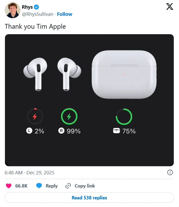 Satu perkongsian di platform X baru-baru ini mencetuskan perbualan hangat dalam kalangan pengguna peranti Apple apabila memaparkan tangkap layar tahap bateri AirPods yang tidak seimbang iaitu satu fon telinga hampir habis, manakala satu lagi masih penuh.