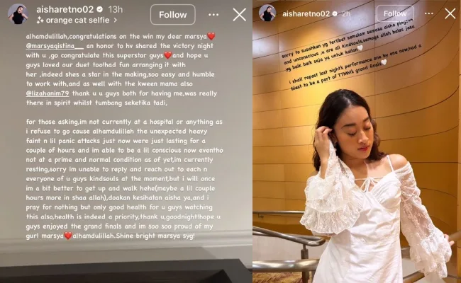 Menurut Aisha, atau nama penuhnya Sharifah Aisha Retno Sayed Sipulijam, 25, insiden itu berlaku secara mengejut ketika dia berada di belakang pentas dengan semangat membara untuk membuat persembahan. “Ada di situ dengan penuh semangat meskipun ‘tumbang’ seketika (pengsan). Kepada yang bertanya, saya tidak berada di hospital sebab saya enggan ke sana,” katanya menerusi hantaran di InstaStory.