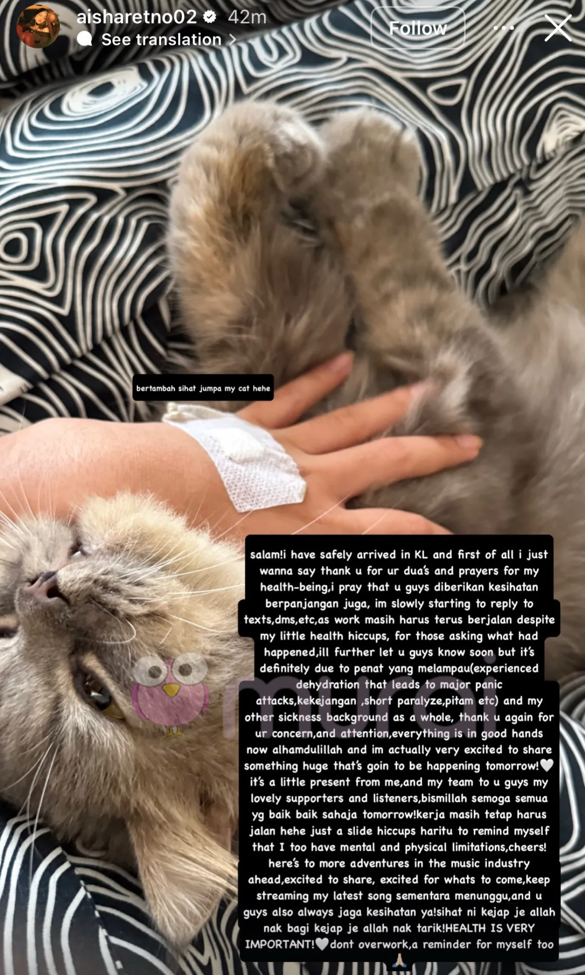 “Saya secara perlahan mula membalas teks, dm, dan sebagainya. Kerja masih harus terus berjalan walau apa berlaku. Saya akan memberitahu anda dengan lebih lanjut tetapi ia semestinya disebabkan penat yang melampau (experienved dehydration that leads to major panic attacks, kekejangan, short paralyze, pitam etc) dan pelbagai masalah kesihatan yang lain.”-kongsi Aisha