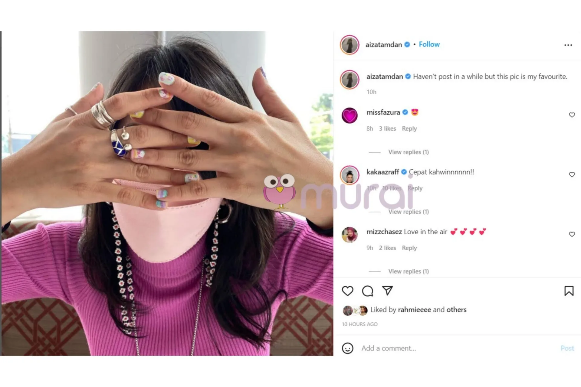 Menerusi hantaran di Instagram, Aizat dilihat memuatnaik sekeping foto seorang wanita yang menutup wajahnya dan memberitahu foto itu menjadi kegemarannya.