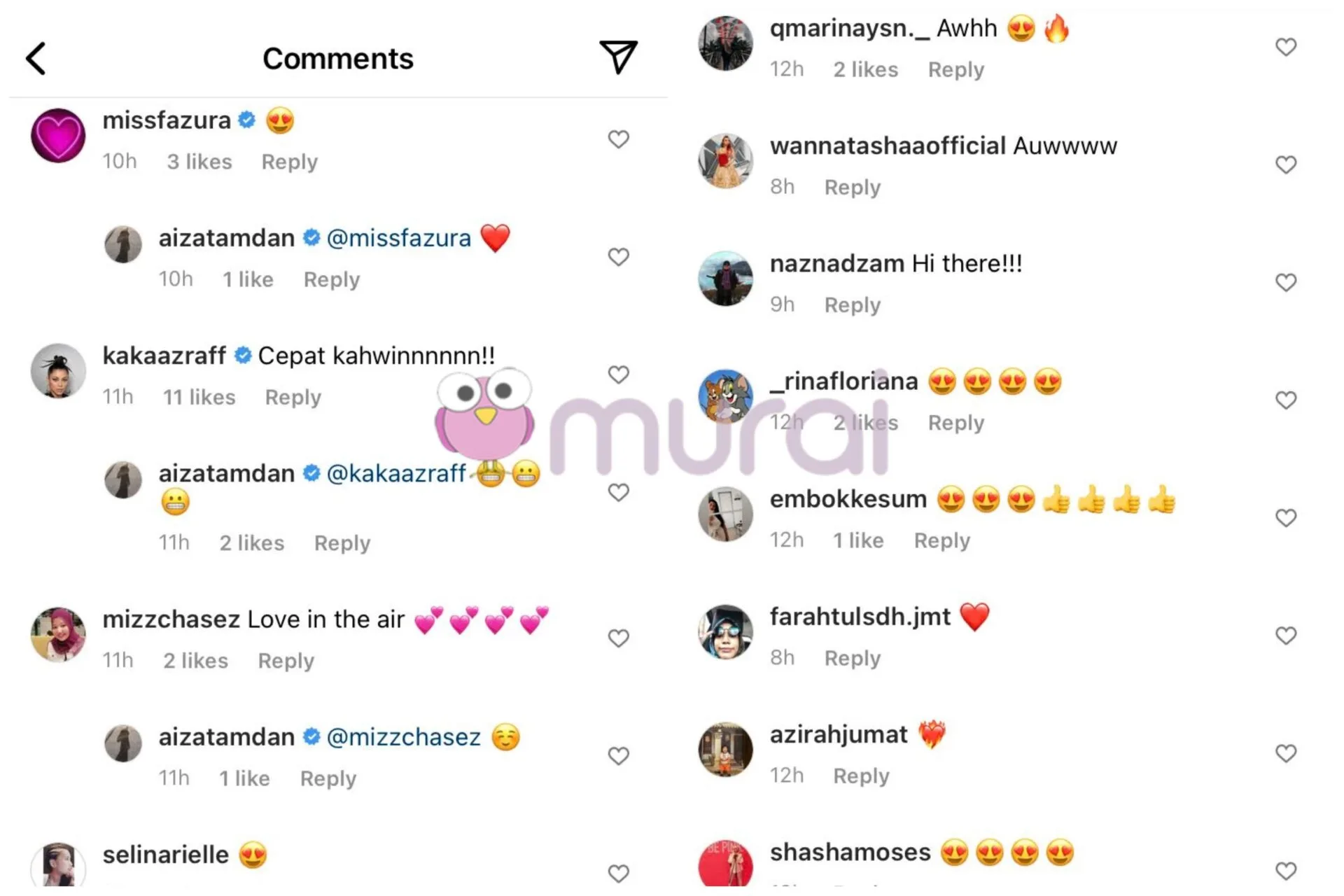 Tinjauan Murai.my di ruangan komen mendapati rata-rata peminat dan rakan selebriti meluahkan rasa teruja seperti Fazura dan Kaka Azraff yang meminta Aizat untuk segera mendirikan rumah tangga.