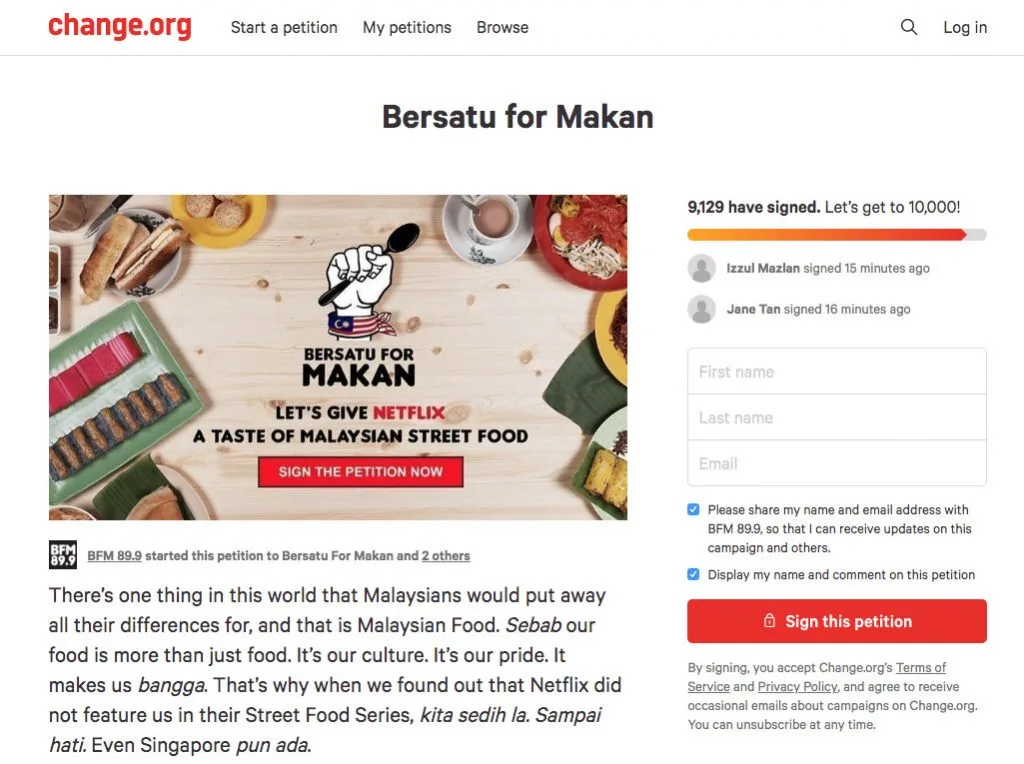 Petisyen itu dimulakan oleh BFM 89.9 dengan menggunakan tajuk Bersatu For Makan dan tandatangan petisyen ini supaya Netflix akan sedar tentang hal ini dan tayangkan video keunikan makanan Malaysia sebagai salah satu siri Street Food mereka!