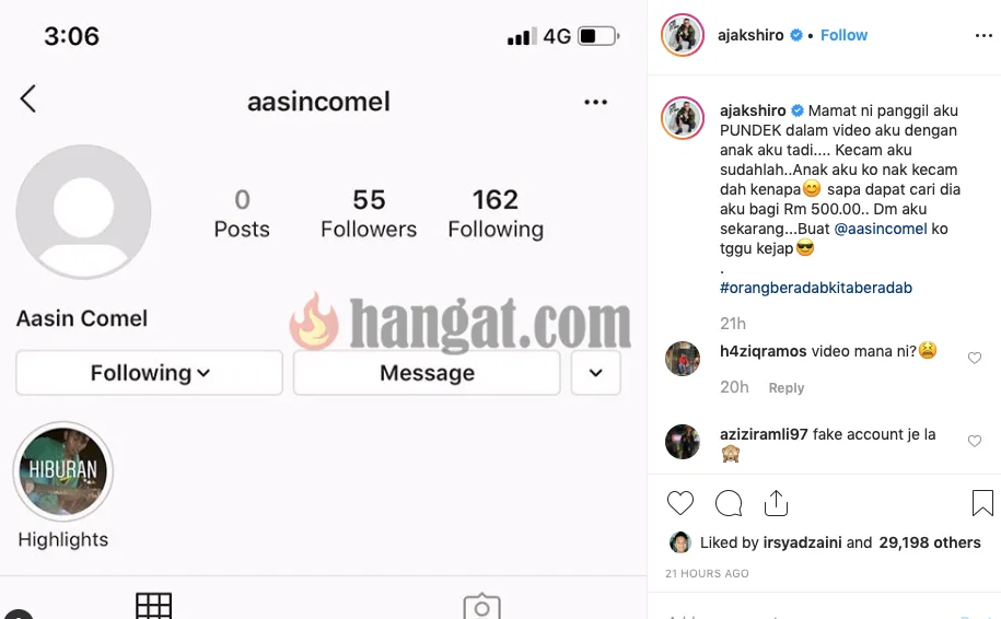 Ekoran itu, Ajak turut menawarkan ganjaran wang ringgit sebanyak RM500 buat pengikutnya yang berjaya menemui netizen tersebut.