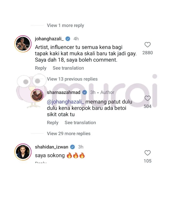 Melalui ruangan komen, Johan menulis, “Artis, Influencer tu semua kena bagi tapak kaki kat muka sekali baru tak jadi gay. Say dah 18 tahun, saya boleh komen.”
