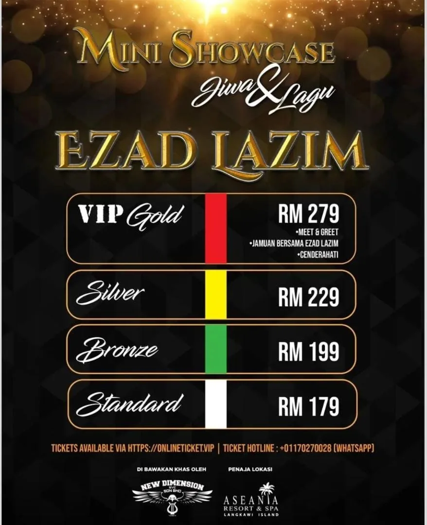 Harga tiket yang ditawarkan adalah bermula dari RM279(Gold), RM229(SILVER), RM199(BRONZE) dan RM179(STANDARD). Perbezaan tempat duduk untuk ditetapkan berdasarkan harga tiket yang dibeli. bagi harga tiket Gold, tempat duduk sangat strategik dimana di tempat paling hadapan dan akan ada sesi meet & greet bersama Ezad. Untuk tiket Silver adalah dibelakang tempat duduk VIP, manakala untuk pembeli tiket Broonze adalah berada di tengah-tengah.