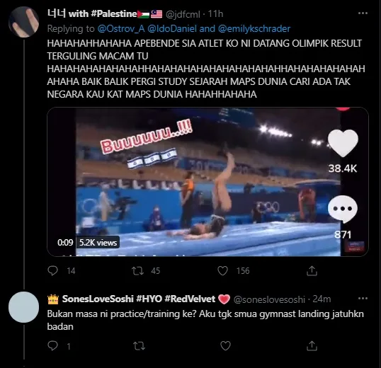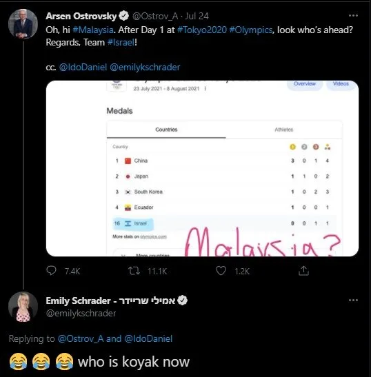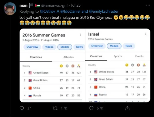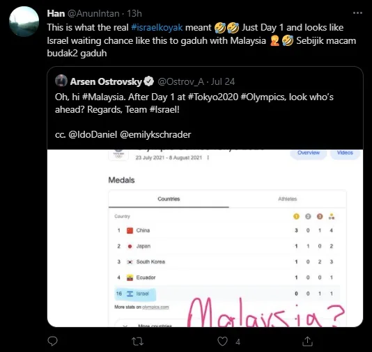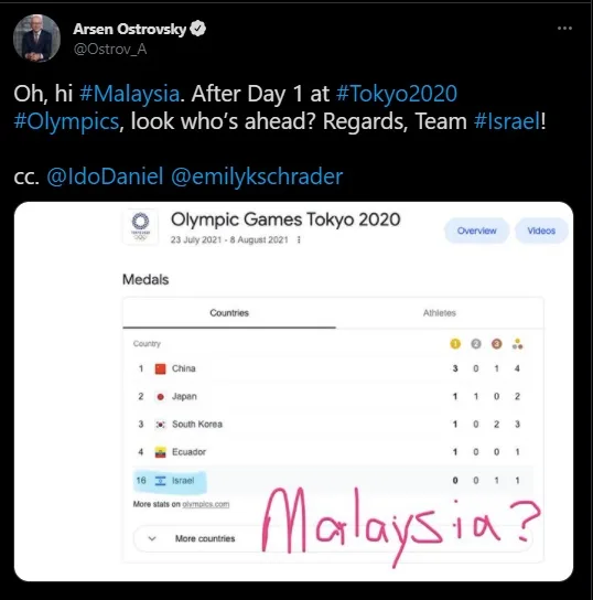 Di Twitter, seorang aktivis Israel iaitu Arsen Ostrovsky dengan bangganya memuat naik pautan carta pingat Sukan Olimpik Tokyo 2020 dengan bertanyakan di manakah Malaysia.
