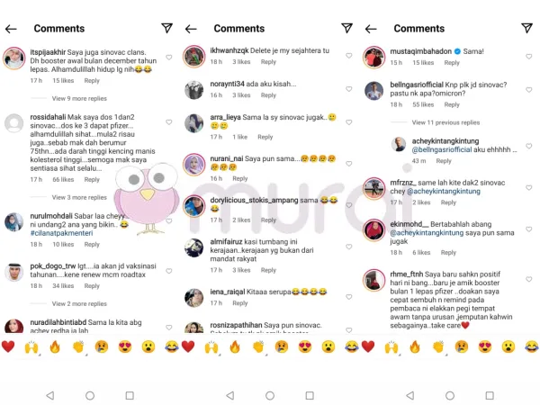 Melihat perkongsian pelawak terkenal itu di media sosial, orang ramai mula membanjiri ruangan komen posting tersebut. Ramai yang berkongsi pandangan mereka dengan meluahkan rintihan hati yang risau dan ada juga yang berkongsi pengalaman telah menerima dos penggalak secara positif.